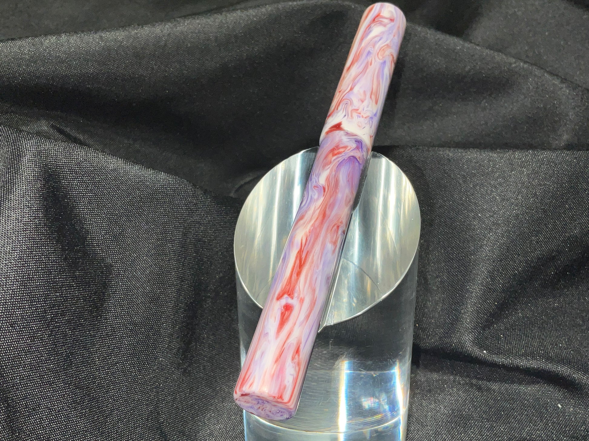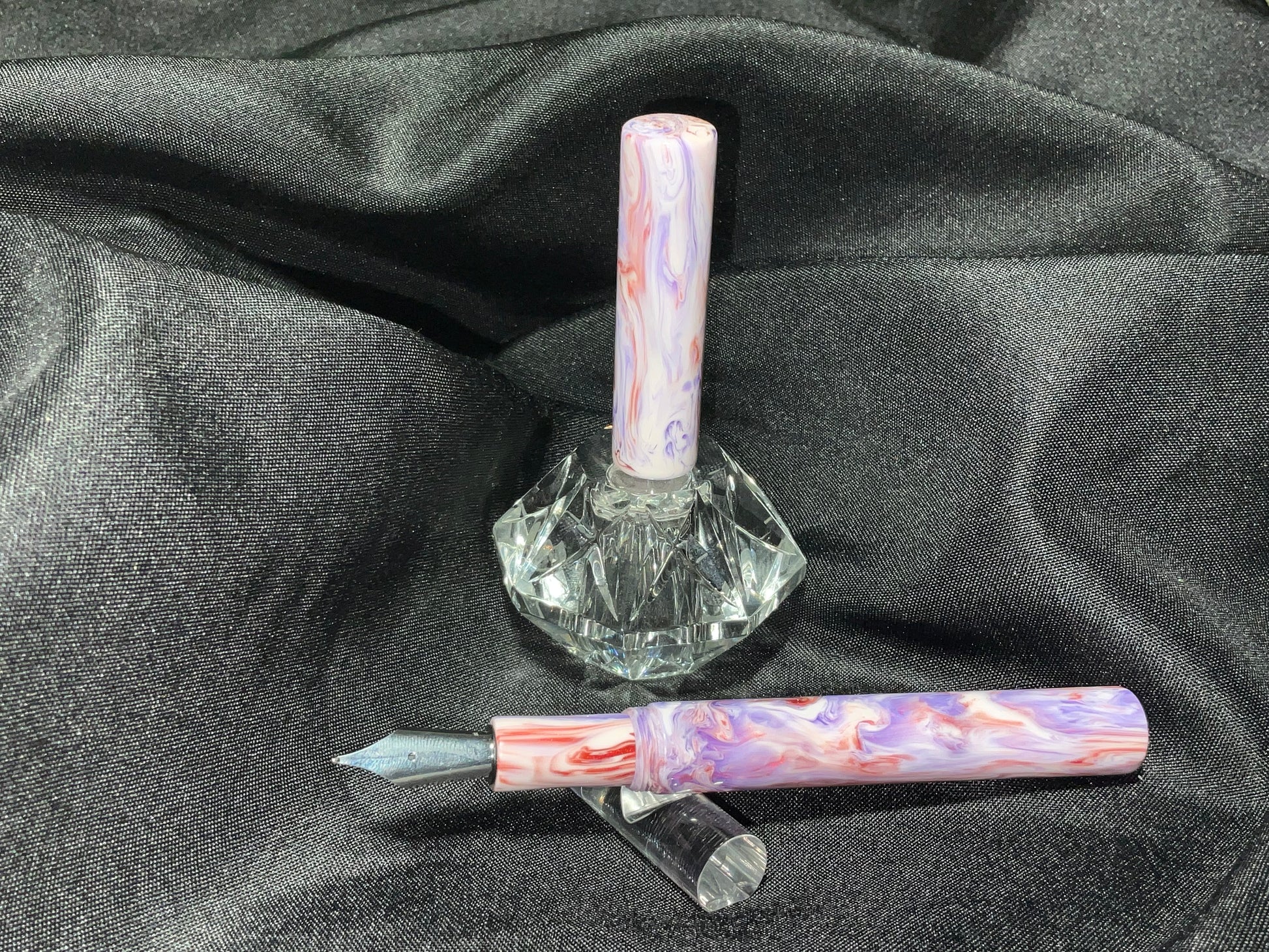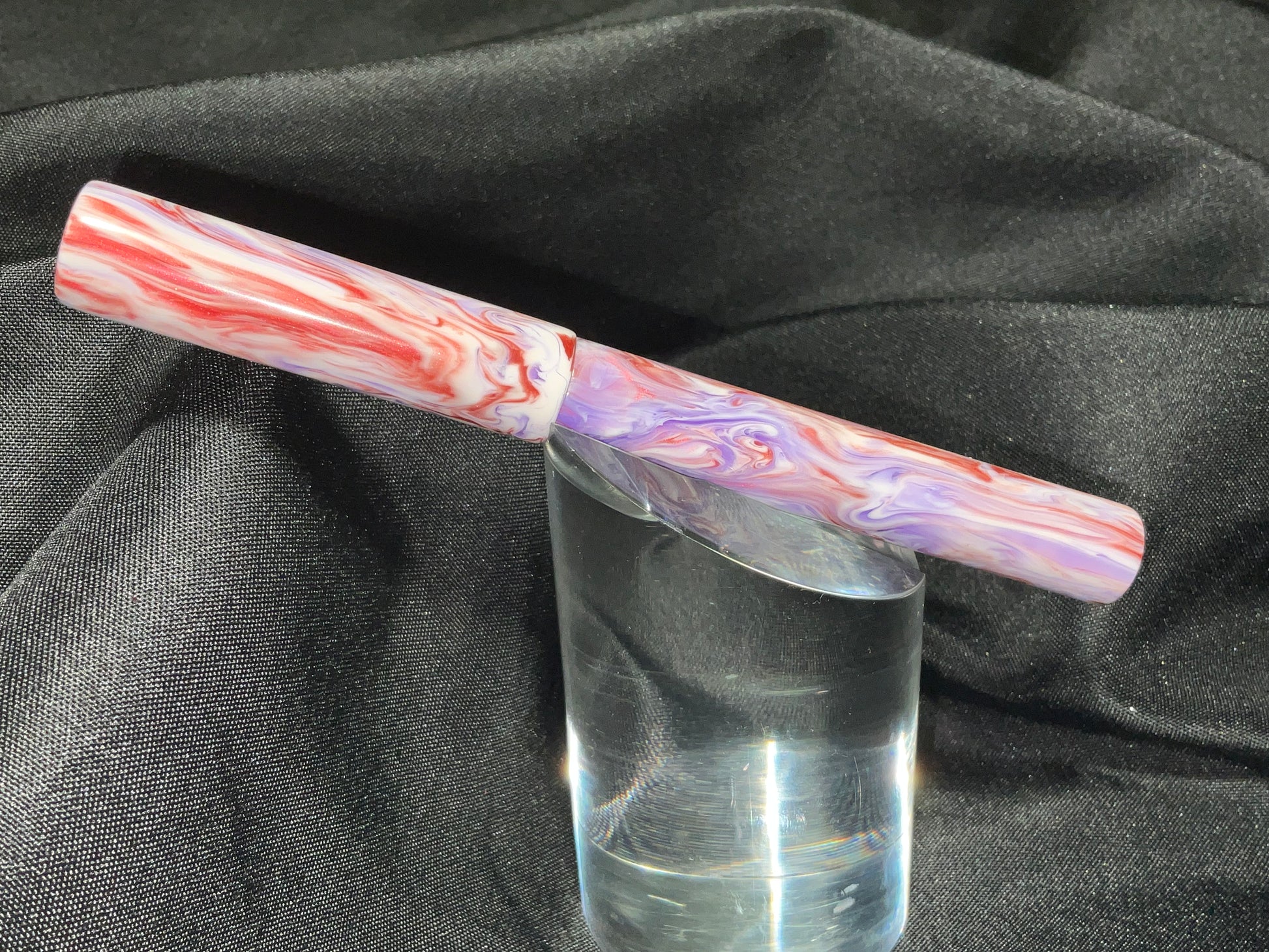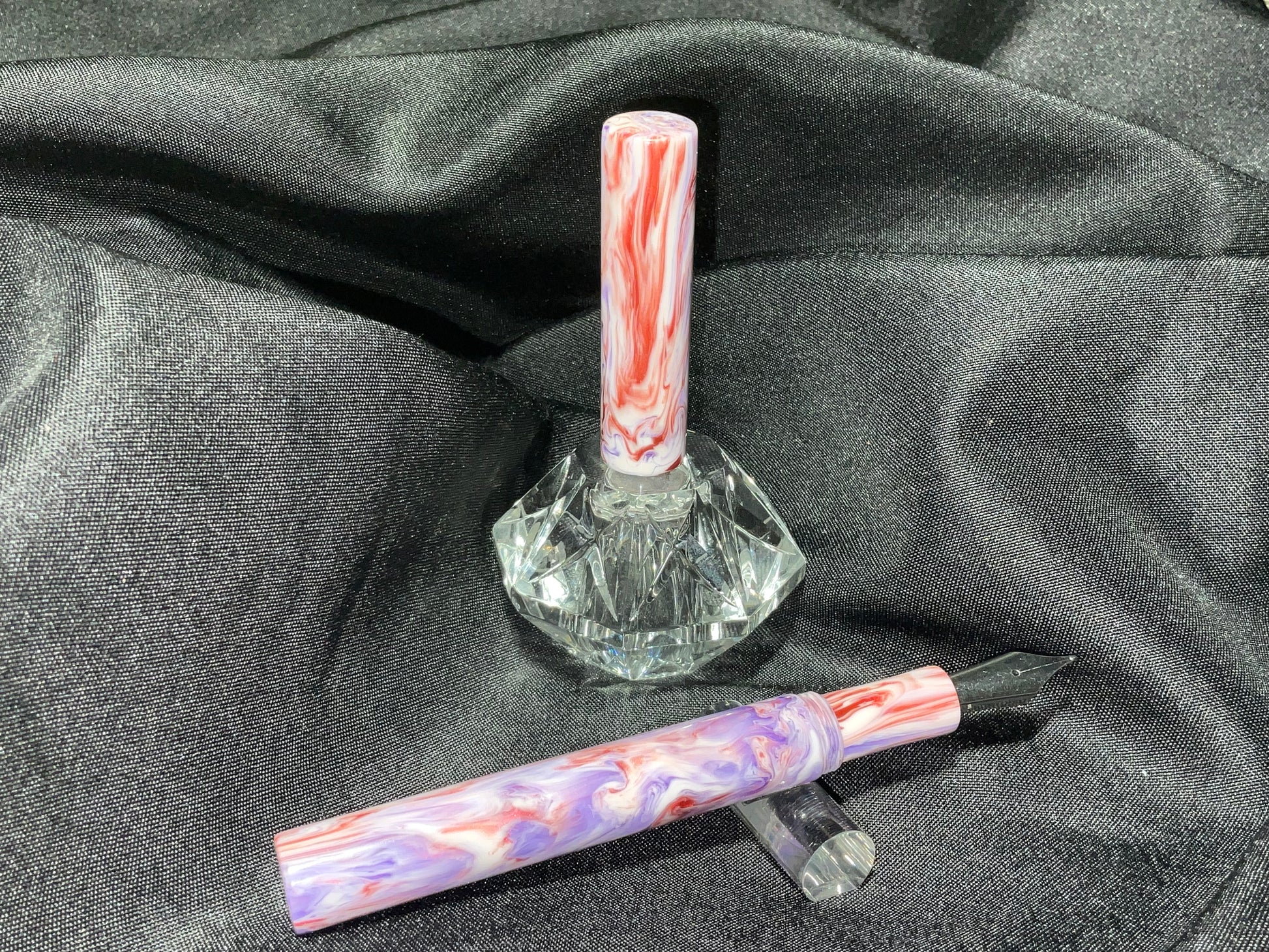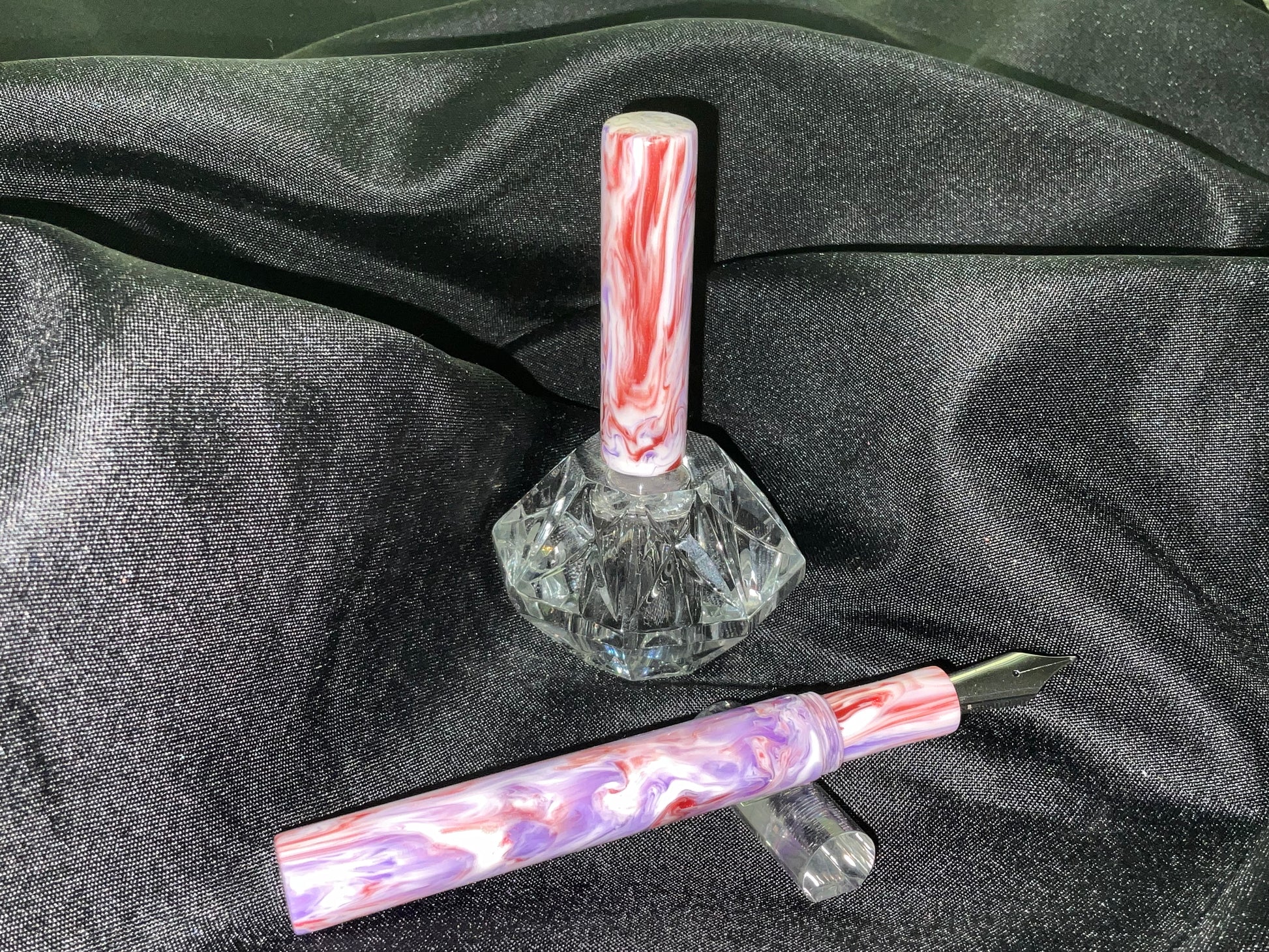 The pen has swirling colors of violet lavender mauve and mulberry that sparkles